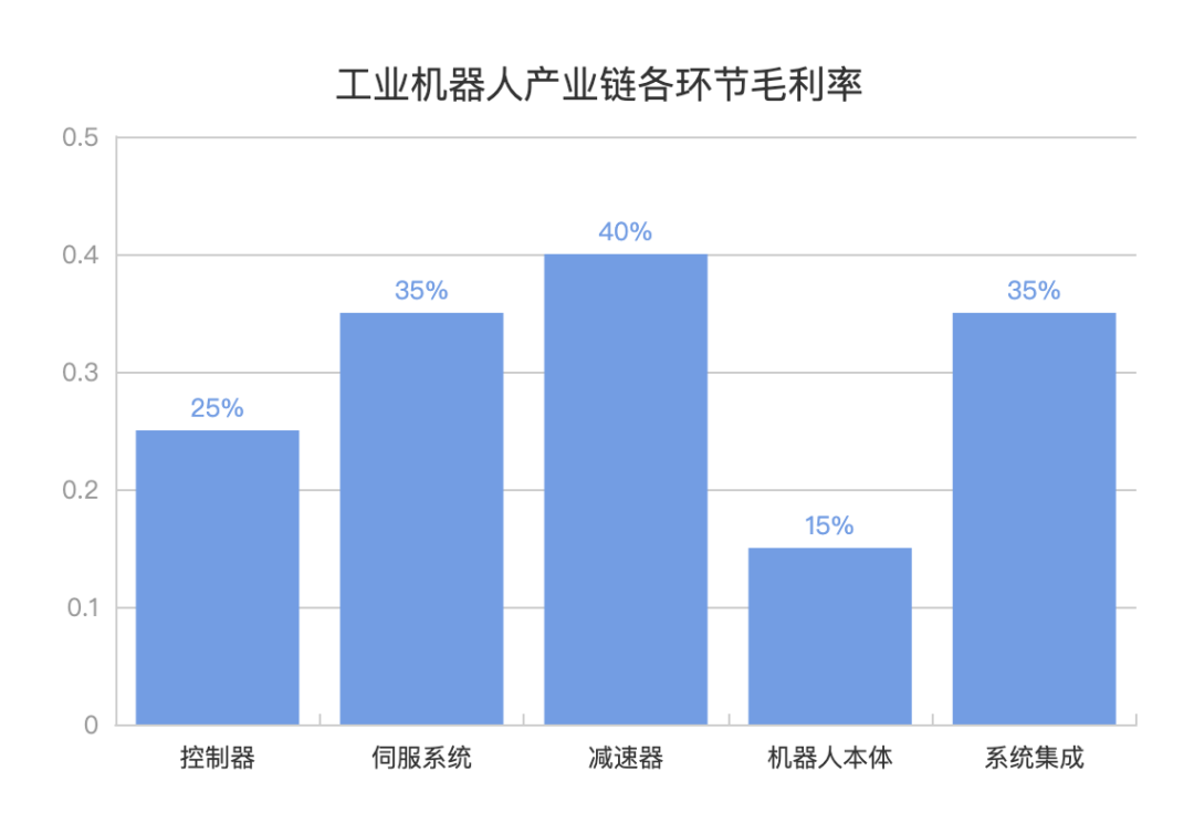 而在利润方面,本体制造仅有15%,三大核心零部件的利润率均高于此:减速器40%,伺服系统35%,控制器25%。