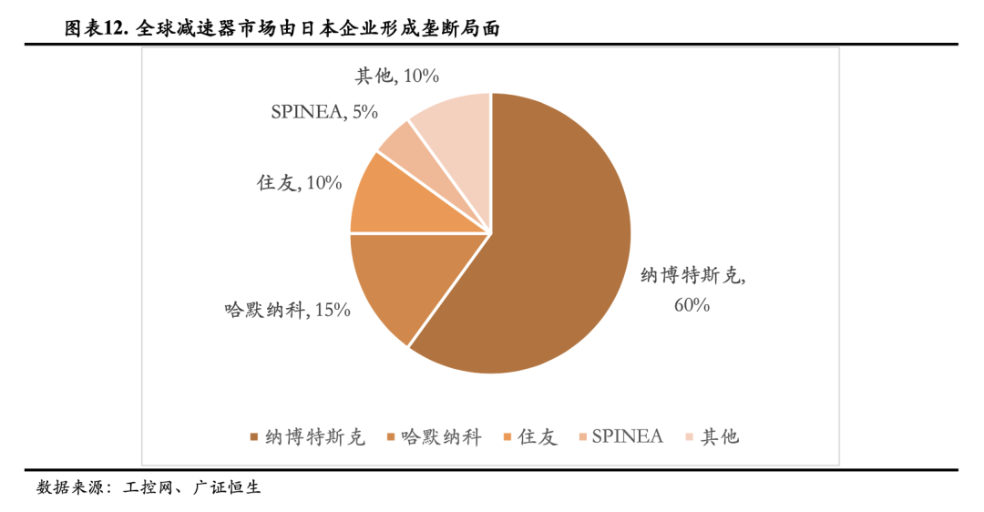 全球减速器市场被日本垄断多年。RV减速器巨头纳博特斯克占据了全球60%的减速器市场,而谐波减速器领先者哈默纳科紧随其后,占据了15%的市场。
