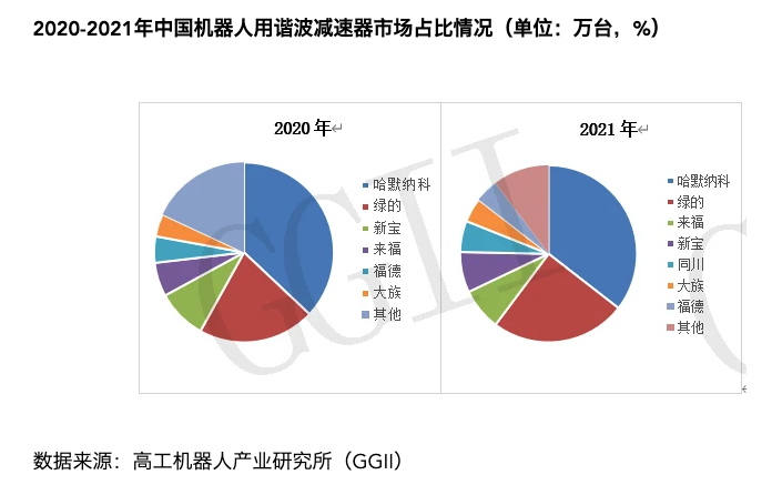 当前,哈默纳科仍然在中国占据较大的市场份额,紧随其后的是国内厂商绿的谐波和来福谐波。这两家企业均有着十余年的研发经验,其谐波减速器产品在输出转速、传送精度等性能上与哈默纳科差距较小,但在精度保持使用寿命、传动效率等方面仍有差距。
