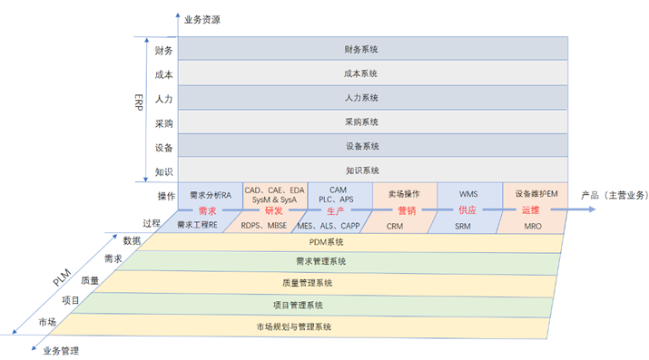 其实,业务资源和业务管理之间并非没耦合性,所以,准确来讲,企业经营不是三条线,而应该是三维坐标系。中间水平轴是传统的产品或主营业务,另一水平轴是业务管理(PLM),垂直的是业务资源(ERP),从而构成立体的工业软件图谱,更能反映真实的企业现状。