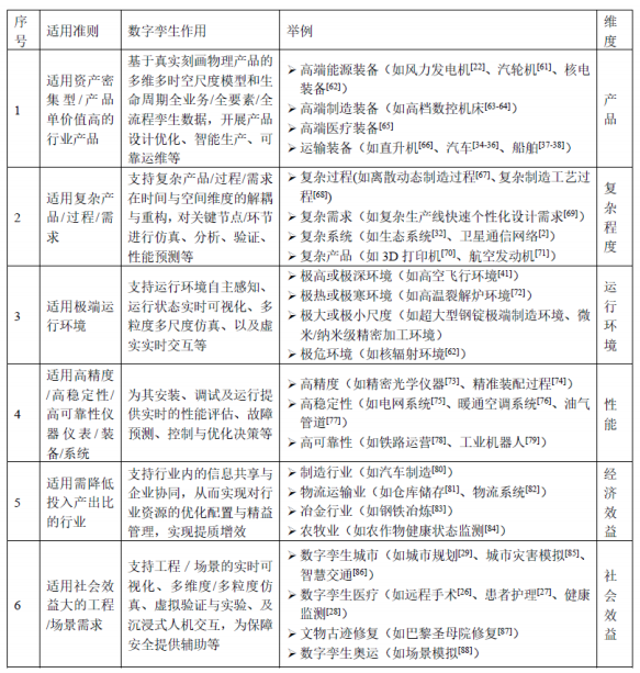 事实上,数字孪生并非适用于所有对象和企业。为辅助企业根据自身情况做出正确决策,本节尝试从产品类型、复杂程度、运行环境、性能、经济与社会效益等不同维度总结数字孪生适用准则,如下表所示,以供参考。
