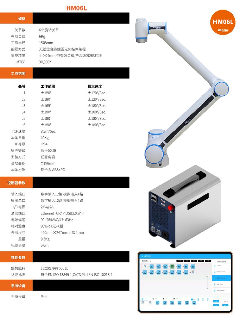 HM06L六轴协作机器人可以自动处理重达6公斤以上的任务并且不会降低精确度,HM06L六轴协作机器人工作半径达到1508mm,是目前市场上负载3kg以上臂展最大的智能协作机器人,也是海默协作机器人系列中工作半径最大的机器人。适用于喷涂、喷釉、焊接等场景。