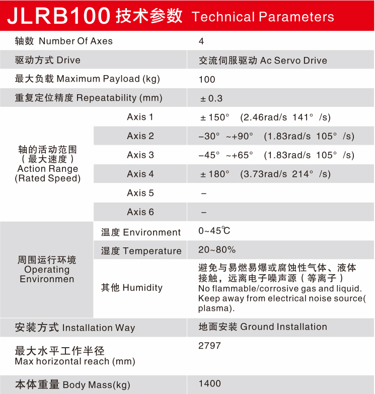 JLRB100特性:手腕负载能力为100Kg,最大工作半径为2797mm。