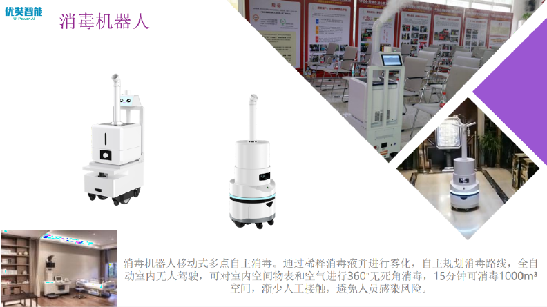 消毒机器人移动式多点自主消毒。通过稀释消毒液并进行雾化,自主规划消毒路线,全自 动室内无人驾驶,可对室内空间物表和空气进行360°无死角消毒,15分钟可消毒1000m³ 空间,渐少人工接触,避免人员感染风险。