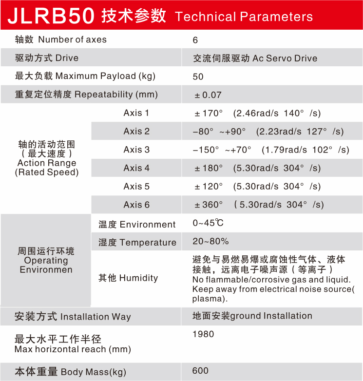 JLRB50特性:结构轻巧,有效负载为50Kg,最大工作半径为1980mm,腕关节采用高精度谐波减速机。