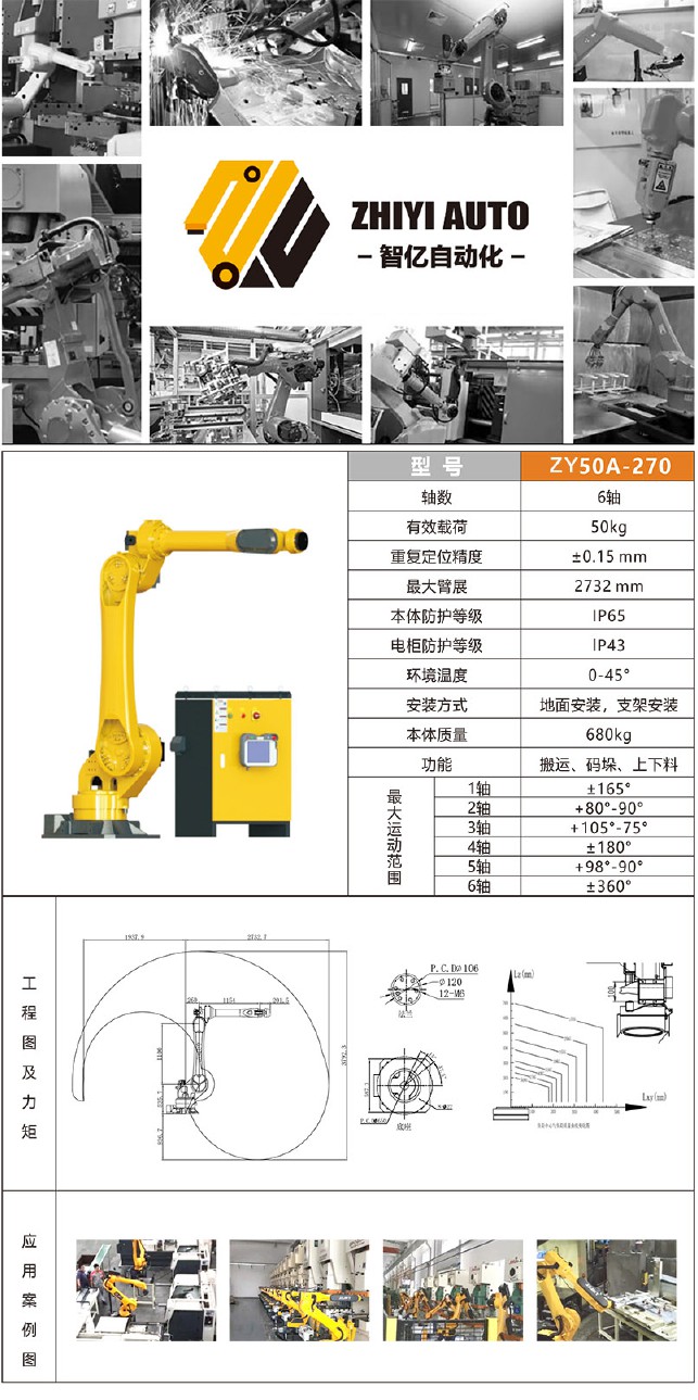 六轴机器人有效载荷50kg,重复定位精度±0.15 mm,最大臂展2732 mm,安装方式地面安装,支架安装。