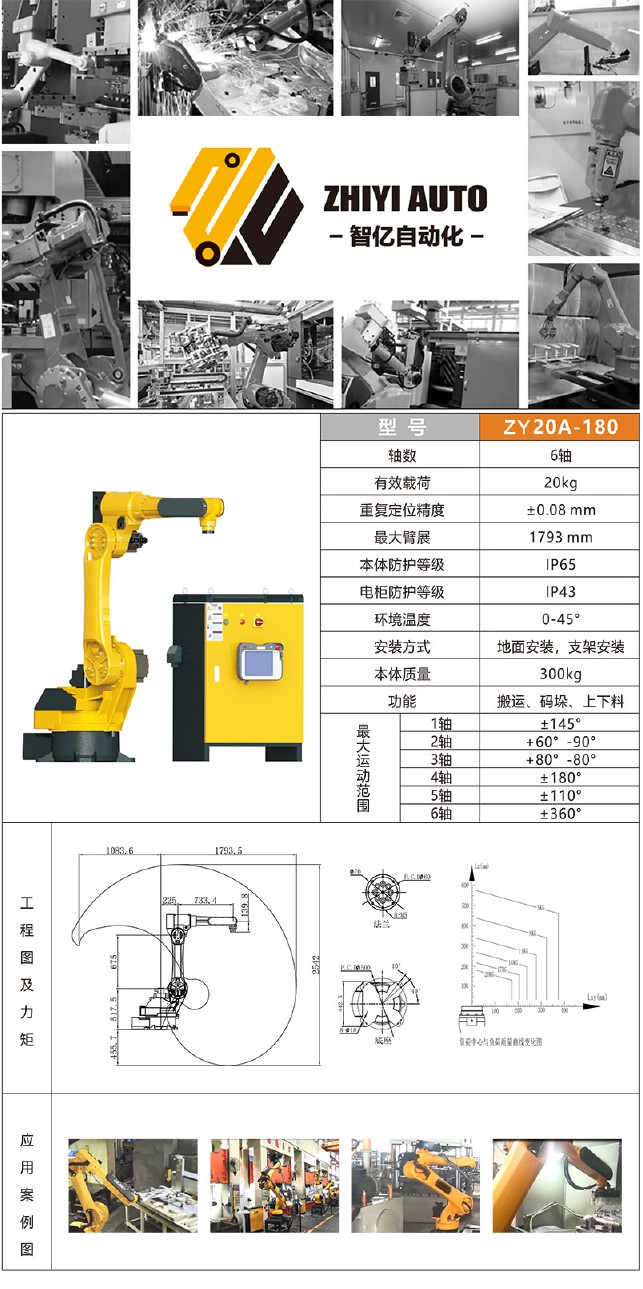 六轴机器人有效载荷20kg,重复定位精度±0.08 mm,最大臂展1793 mm,安装方式地面安装,支架安装。