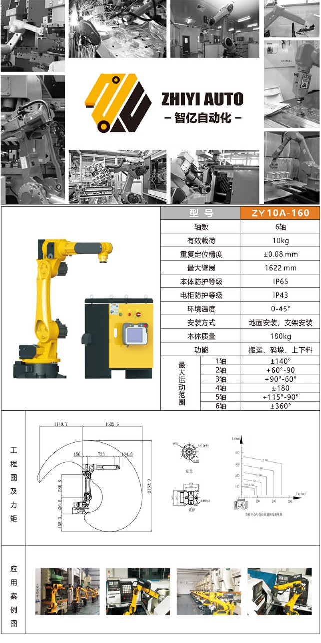 六轴机器人有效载荷10kg,重复定位精度±0.08 mm,最大臂展1622 mm,安装方式地面安装,支架安装。