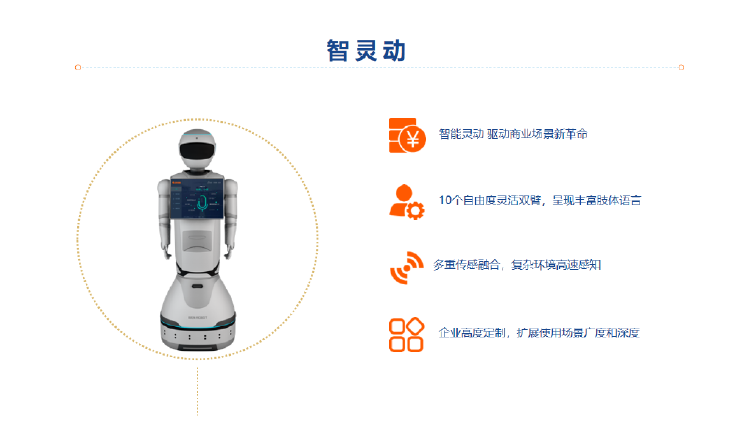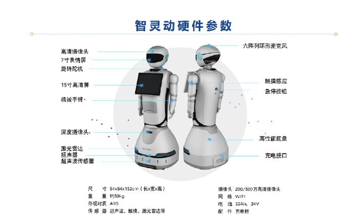 智灵动具备开放、灵活、丰富、便捷的智能场景接口,可将机器人本体与各模块协作,作为智能物联核心控制中枢,结合云计算技术、物联网技术与各类智能硬件进行链接,可有效提升使用场景的智能化、科技感