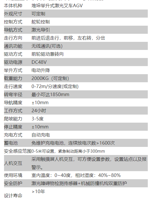 欧铠重型堆垛举升式激光叉车AGV参数规格: