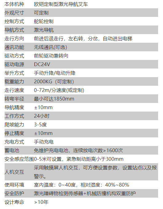 欧铠定制型激光叉车,基本负载2吨;叉车顶部配备前后2个激光防撞传感器保障安全运行,配有自动充电系统;在没有人操作的状态下,即可自动叉取/卸载物料,能轻松完成一系列“重体力活”存取货物的任务,此款叉车广泛应用于车间物料仓储周转运输。