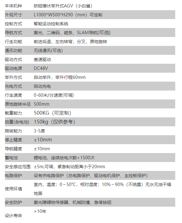 移载形式举升式,潜伏式 | 驱动形式差速驱动 | 引导形式磁导航,激光导航,二维码导航 |