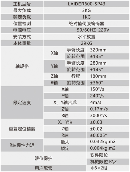 LAIDER600-SP43水平多关接机器人主要应用领域:物料搬运、零部件传输、堆垛、点胶