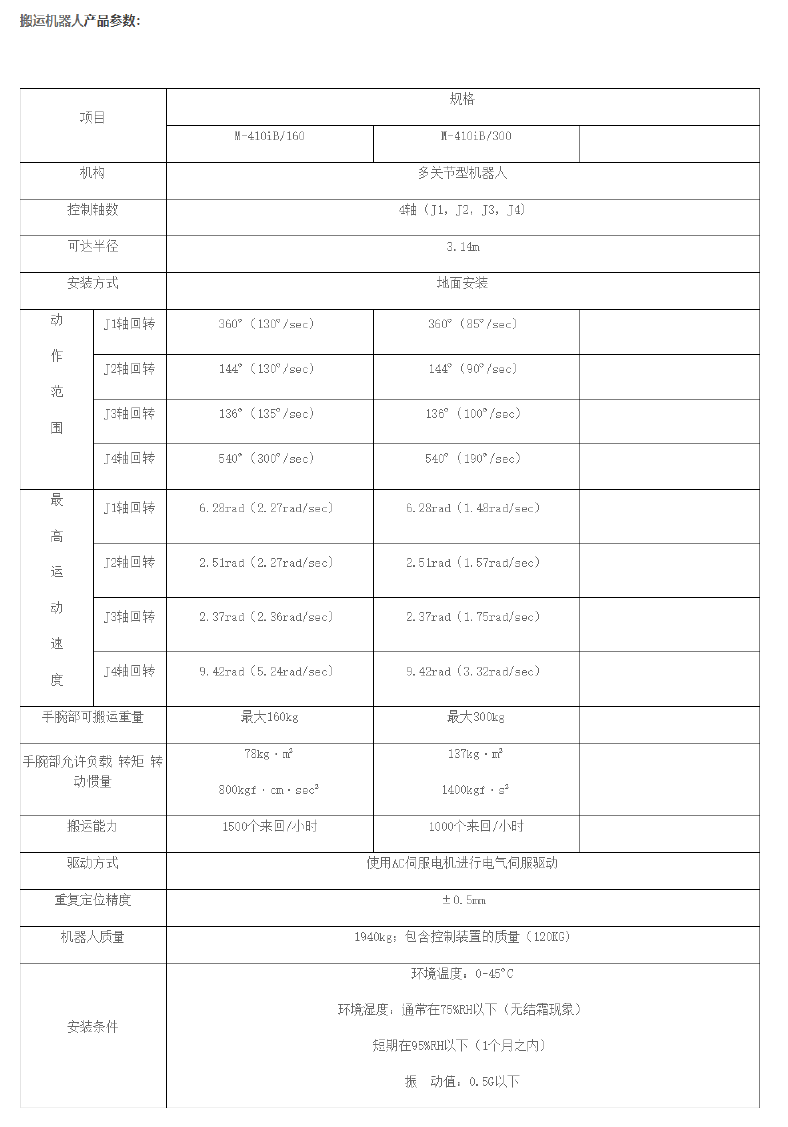 。可以根据搬运工件的特征选择最合适的机型。 FANUC Robot M-4101B/140H可搬运质量140kg/高速搬运型 FANUC RobotM-4101B/160可搬运质量160kg/高速搬运型 FANUC Robot M-4101B/300可搬运质量300kg/重负载型 FANUC Robot M-4101B/450可搬运质量450kg/重负载型 FANUC Robot M-4101B/700可搬运质量700kg/超重负载型