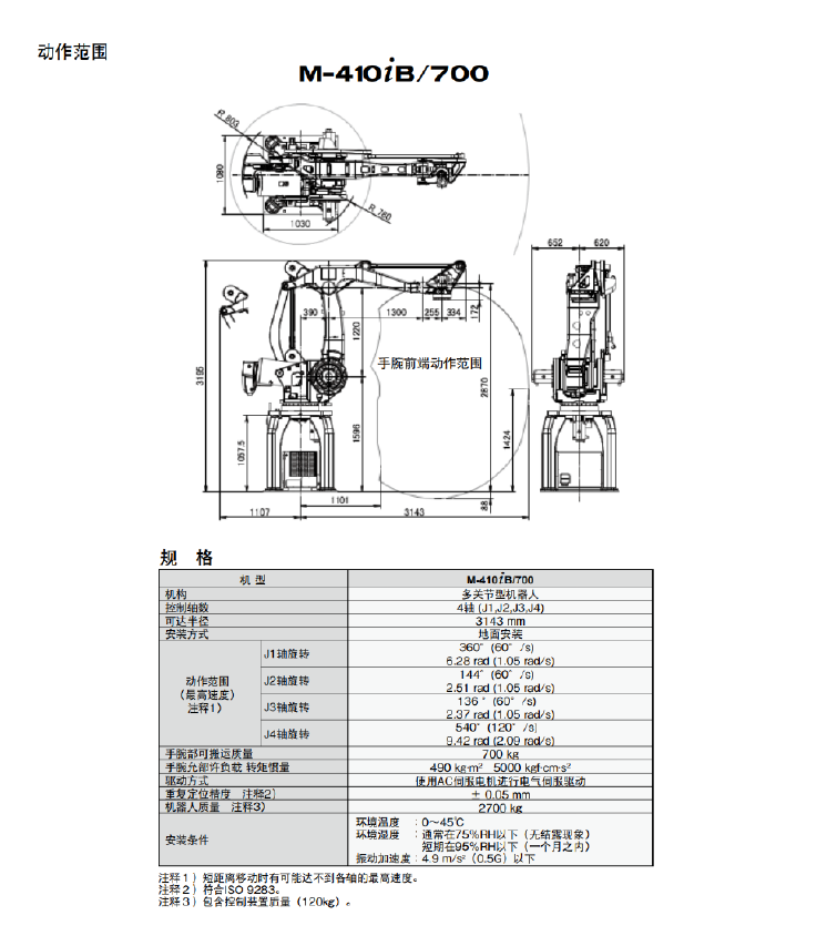 。可以根据搬运工件的特征选择最合适的机型。 FANUC Robot M-4101B/140H可搬运质量140kg/高速搬运型 FANUC RobotM-4101B/160可搬运质量160kg/高速搬运型 FANUC Robot M-4101B/300可搬运质量300kg/重负载型 FANUC Robot M-4101B/450可搬运质量450kg/重负载型 FANUC Robot M-4101B/700可搬运质量700kg/超重负载型
