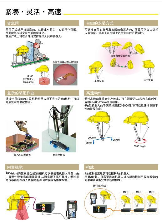 1轴手腕型的机器人,手腕前端可以完成3000度/秒的高速旋转适用于拾取作业。机器人合计3轴
