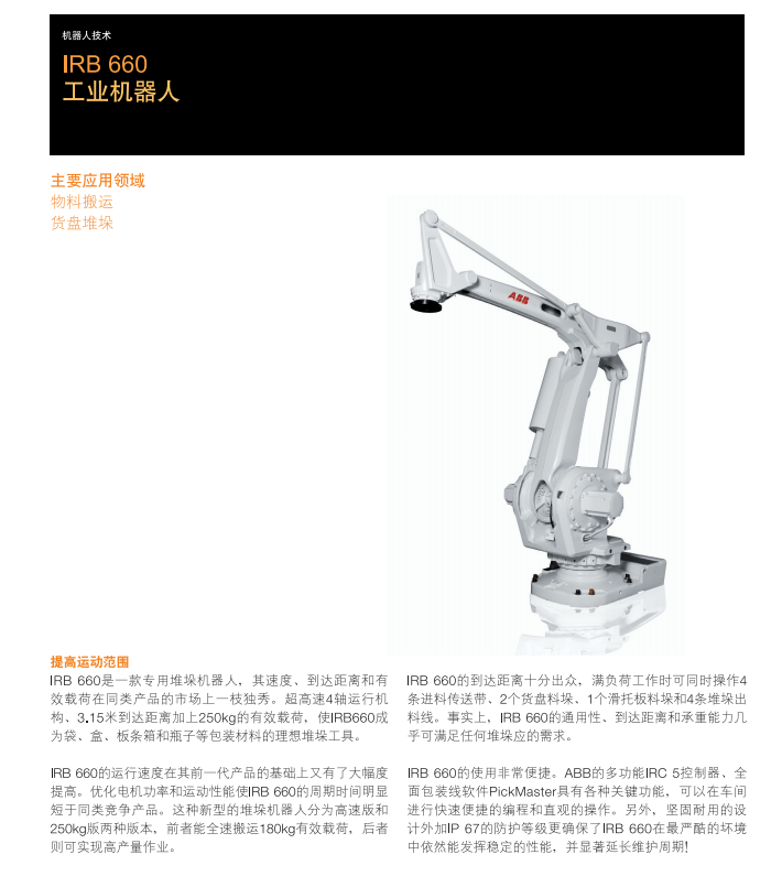 网站首页 > 产品展示 > 工业机器人 > ABB工业机器人 IRB 660-250/3.15 负载250kg工作域3150mm 搬运/码垛/上下料 工业机器人 2023-05-27 机器人网 0 百度一下 2023-05-27 机器人网 0 百度一下 适合行业 工业机器人 发布作者 机器人网 最近更新 2023-05-27 18:14:29 概述: 文章详情 品牌名称ABB 轴数 : 4负载 : 250kg工作区域 : 3150mm精度 : 0.1mm防护级别 : IP67版本 : 码垛版安装方式 : 落地本体重量 : 1650kg主要应用 : 上下料,物料搬运,包装,码垛能耗 : N/A 联系我们: 上海ABB工程有限公司 ☉本站某些信息具有时效性,若有错误或已失效,需要更改请留言修改