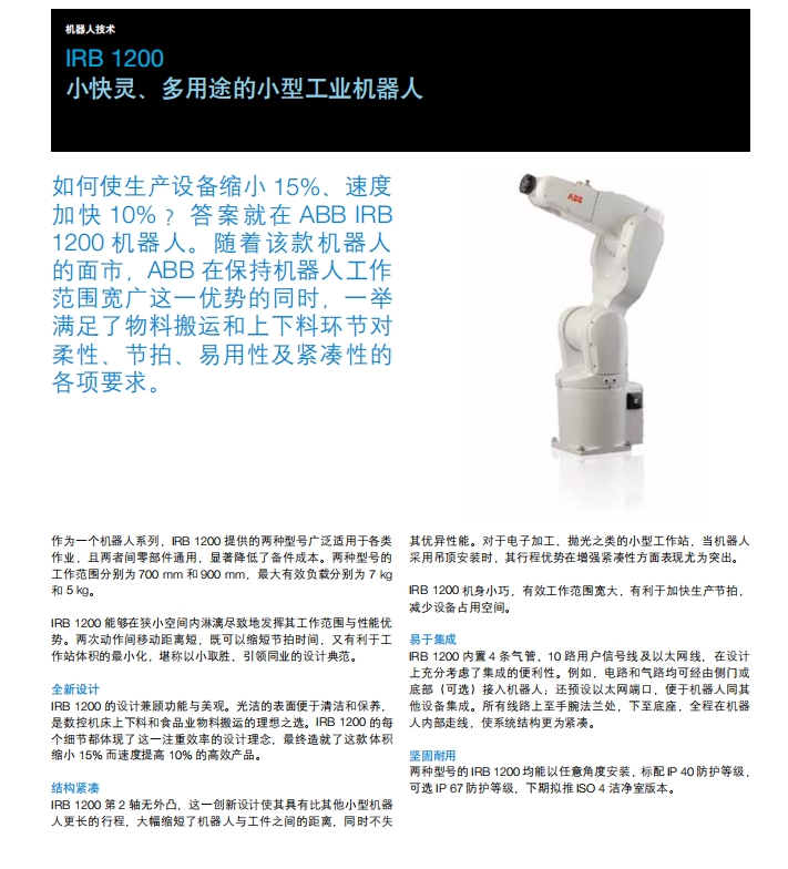 ABB工业机器人IRB 1200-7/0.7范围0.7米 荷载7KG上下料、物料搬运机械手