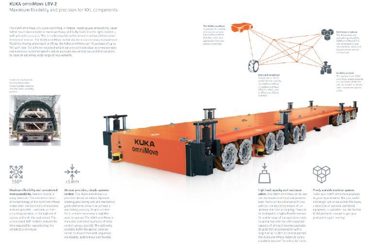 KUKAomniMove可根据飞机型号安全和方便地移动即使是XXL规格的重型工件。它的负载能力达90吨,并且在超大一种规格中长度达30米。