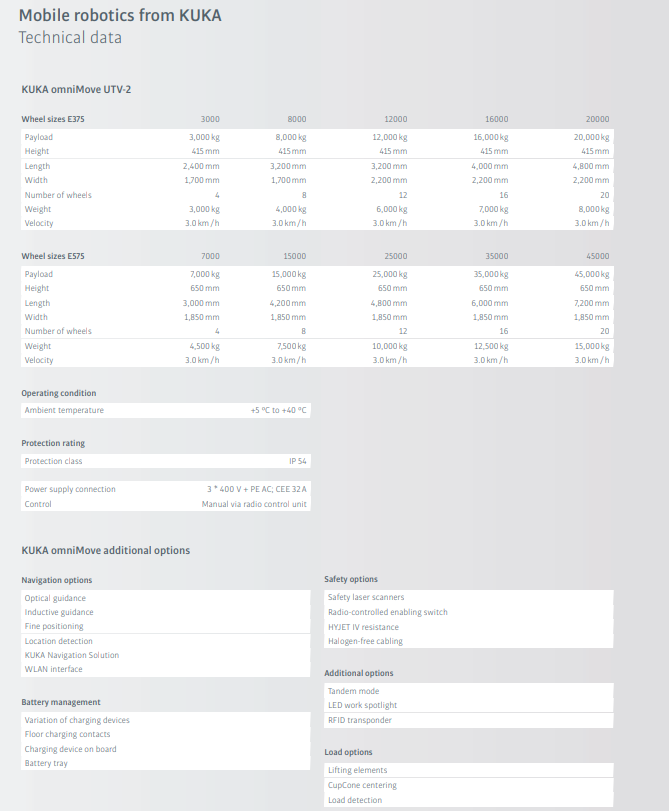 通过专门开发的车轮,移动式重载型平台可以全向移动——包括从静止状态瞬时起动。成熟的KUKANavigationSolution导航系统确保在没有碰撞危险和地面人工标记的情况下自主移动。KUKAomniMove采用模块系统,在尺寸、宽度和长度方面可以任意缩放——完全按照您的个性化要求。