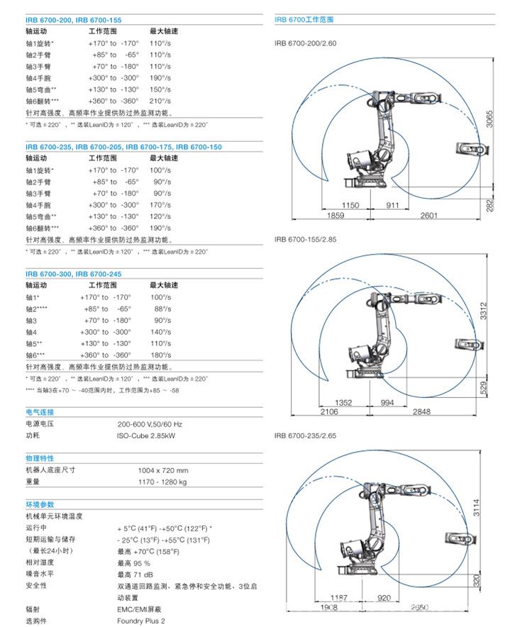IRB 6700 机器人系列是 ABB 大型机器人40多年技术演进的成果。作为新一代的技术产品,ABB第七代大型机器人基于详尽的客户反馈和细致的工程研究,实现了多项改进和提升。在150kg 至300kg的同类产品中,IRB 6700性能最为突出。与其之前的版本相比,IRB 6700 系列不仅结构刚性更好,无故障运行时间更长,性能提升且维修简化,其总拥有成本降低20%。多款型号该系列机器人的正常运行时间更长、负载更大、工作范围更广,可用于汽车和一般工业领域的点焊、物料搬运和机床上下料等应用。IRB 6700有多款型号,负载为150kg 至300kg,工作范围为 2.6 m 至 3.2 m,有落地式和倒装式版本可选。强健可靠整个机器人结构刚性更好,从而使精度提升、节拍时间缩短且防护增强。它能够适应严苛的工作环境,还可选配ABB 铸造专家II代(Foundry Plus 2)防护系统。同时,为确保在实际应用中对可靠性的预测准确无误,IRB 6700定型阶段采用比以往更多的原型机,对各类实际应用进行全面地验证和检测。
