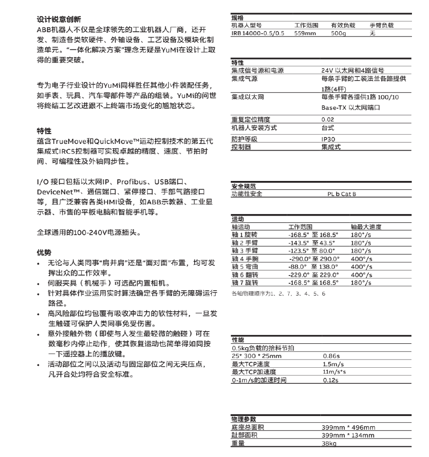 YuMi是ABB人机协作的双臂机器人,是为人类与机器人并肩共事一款产品。YuMi紧凑的双臂式设计刻意模仿人体结构,给人以亲和友善,其大小正好适合安置于人类的操作工位。