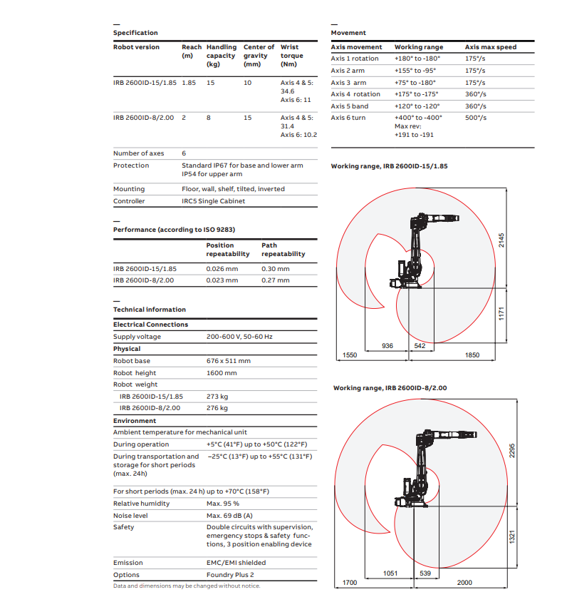 IRB 2600ID工业机器人在弧焊、物料搬运以及上下料的应用中省空间增产能。该机型采用集成配套(ID)技术并扩大了工作范围,弧焊节拍时间最多可缩短15%,占地成本减少75%. IRB 2600ID有两种机型: 荷重15千克、到达距离1.85m;荷重8千克、到达距离2.0m。