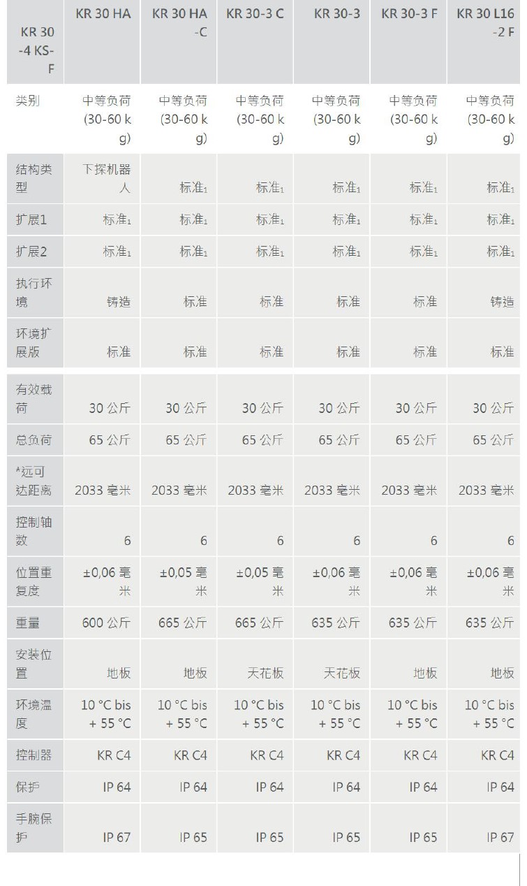 搬运、焊接、粘贴、铸造甚至自动缝纫 – KR 30 几乎无所不能。凭借 30 kg 的负载能力和*大 3102 毫米的作用范围以及灵活的安装位置(地面、天花板、墙壁或倾斜位置),这款六轴机器人是自动化领域名副其实的专家。多样化的规格,例如高精度机器人、架装版本或者铸造版本,让越来越多的行业能够从 KR 30 的优势中获益:精确、快速且高效。