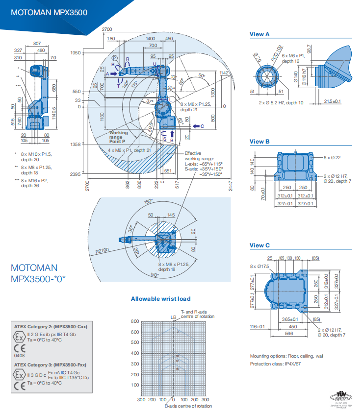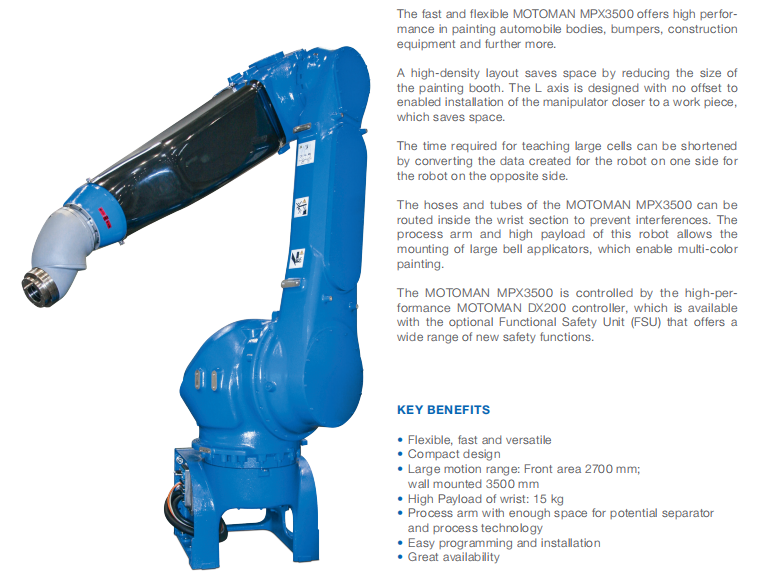 安川MPX3500 6轴 负载15kg 工作域2700mm 喷涂机器人产品特点: