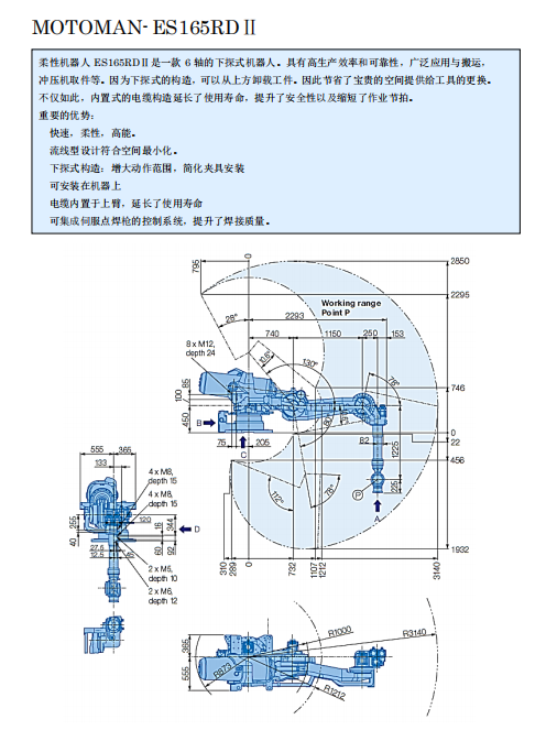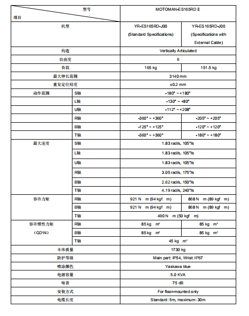 安川MOTOMAN-ES165RDⅡ 6轴 负载165Kg工作域3140mm 多功能机器人产品特点:
