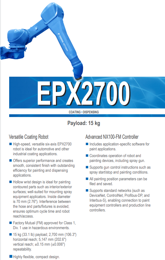 安川EPX2700 6轴 负载15Kg 工作域2700mm 喷涂机器人产品参数:
