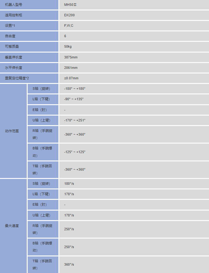安川MH50II 六轴 负载50Kg 工作域2061mm 搬运机器人产品特点: