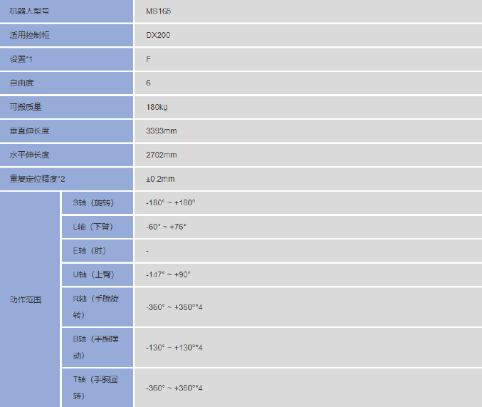 安川MS165 六轴 负载180Kg 工作域2702mm 点焊机器人产品特点: