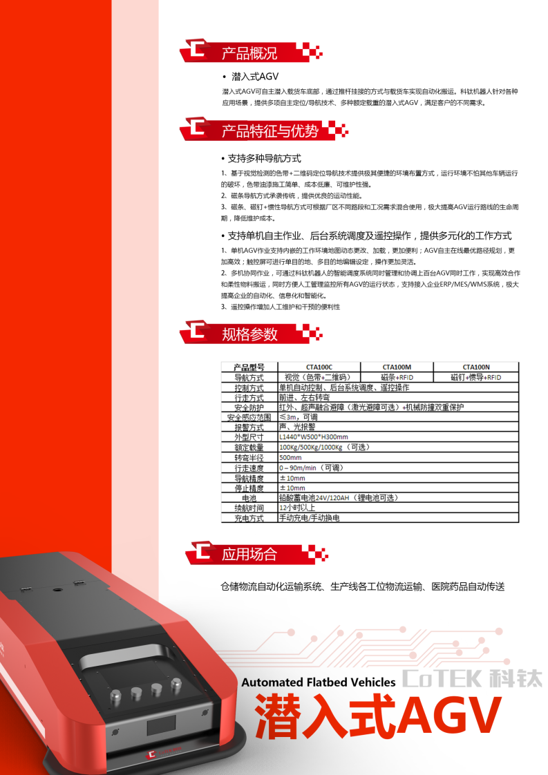 科钛 二维码导航 负载100kg 潜入式AGV产品特点: