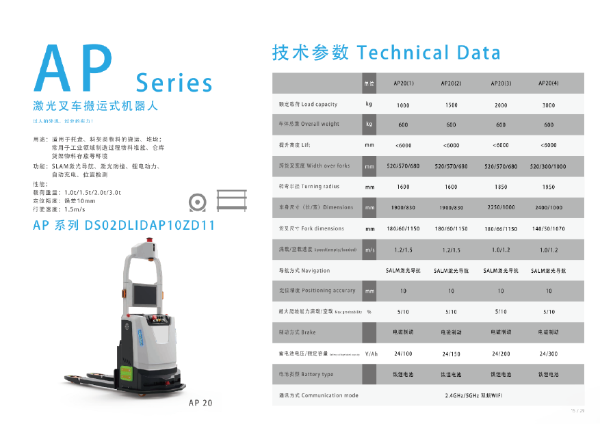 移载形式叉车式 | 驱动形式差速驱动 | 引导形式激光导航 |
