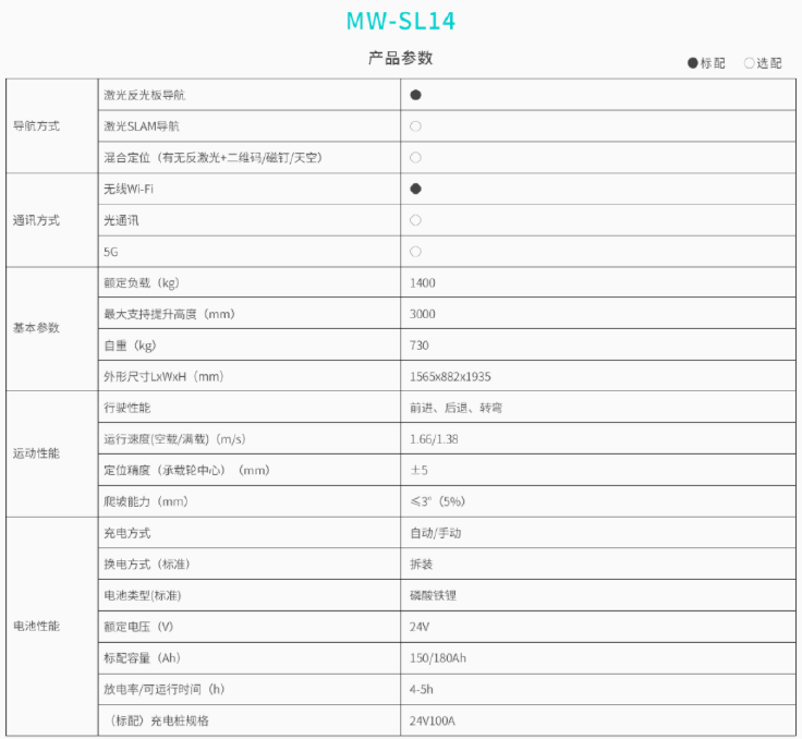 劢微 激光反光板导航 负载1400kg 堆高式 举升高度3000mm MW-SL14叉车产品特点: