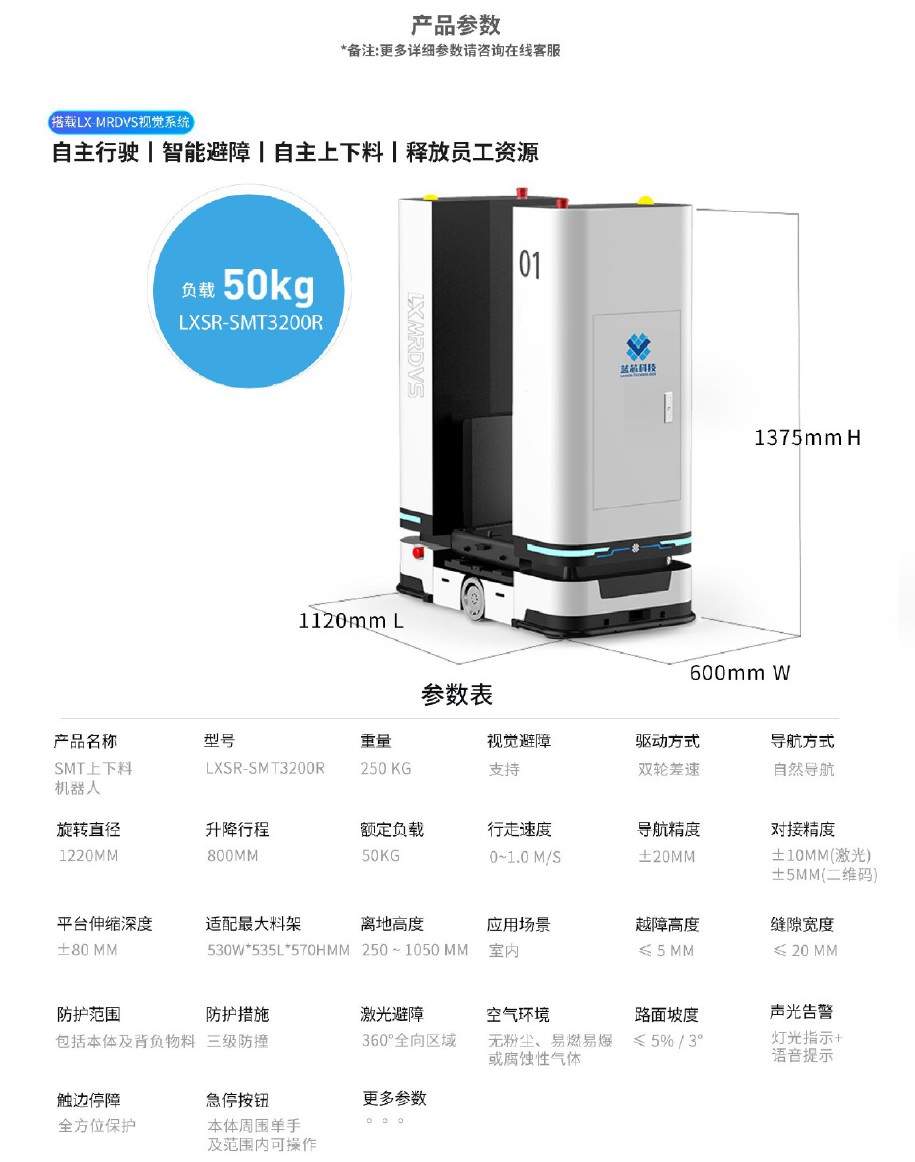 LXSR-SMT3200R是一款专为SMT贴片行业研发的自主上下料机器人,具有自主搬运、自主上下料功能,帮助SMT企业释放员工资源,满足SMT高频上下料需求,提高SMT企业生产自动化程度和企业竞争力。