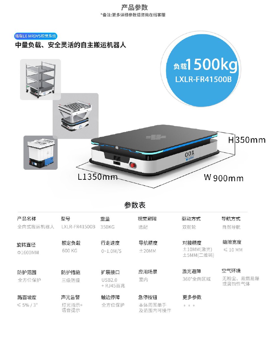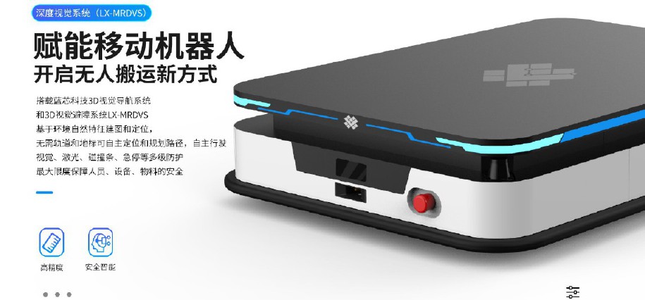 搭载蓝芯科技3D视觉导航系统 和3D视觉避障系统LX-MRDVS 基于环境自然特征建图和定位, 无需轨道和地标可自主定位和规划路径,自主行驶 视觉、激光、碰撞条、急停等多级防护 最大限度保障人员、设备、物料的安全