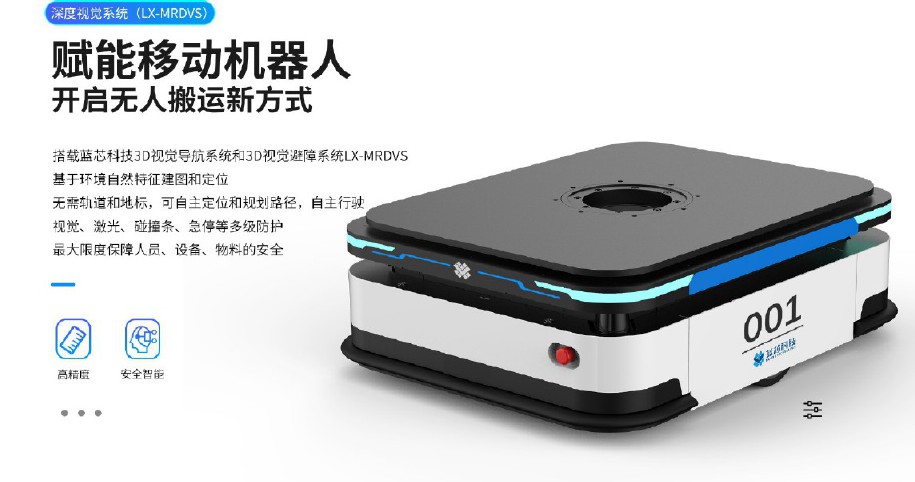 搭载蓝芯科技3D视觉导航系统和3D视觉避障系统LX-MRDVS 基于环境自然特征建图和定位 无需轨道和地标,可自主定位和规划路径,自主行驶 视觉、激光、碰撞条、急停等多级防护 最大限度保障人员、设备、物料的安全
