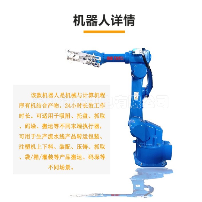 该机器人是针对多自由度的复杂应用而开发的六轴机器人。其负载10kg-100kg,拥有1500-4000mm的臂展。腕部采用中空结构,走线更方便、动作更灵活。防护等级高——IP54,防尘防水,精度高——重复定位精度±0.06mm-0.1mm。
