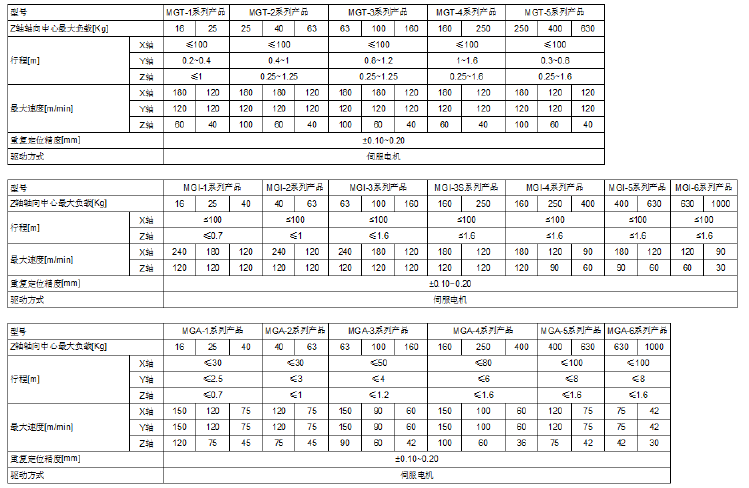 M系列模块化桁架机器人产品为新松公司多年技术积累、多代技术更迭的成熟产品,采用垂直多关节形式机器人结构,实现高精度、高速度、低震动多轴复合运动。依照不同结构形式分为MGI、MGA、MGT、MGH四个子系列,以适应不同用途。M系类桁架机器人采用模块化设计,用户可根据需要进行模块化拼装,立柱间距可根据设备排布柔性化安装。导轨采用新松公司自行设计研发的矩形导轨,精度高,易于装配调整,配合滚轮轴承,可实现长距离高速运动,且震动及噪音较直线导轨大大降低。采用伺服控制,可实现多轴高精度协调运动。M系类模块化桁架机器人以其高精度、高速度、柔性化等特点广泛应用于零部件加工及平面物料搬运仓储等行业。