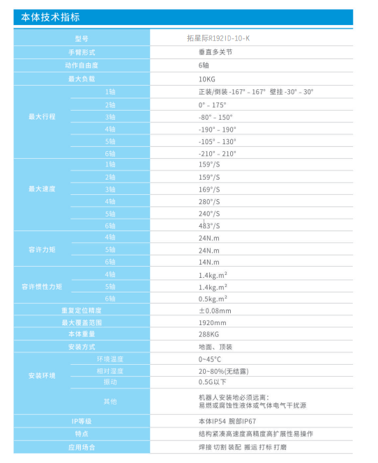 工作空间大、运行速度快、重复定位精度高,适用于焊接、喷涂、上下料、搬运、分拣、装配等应用,适用范围广。