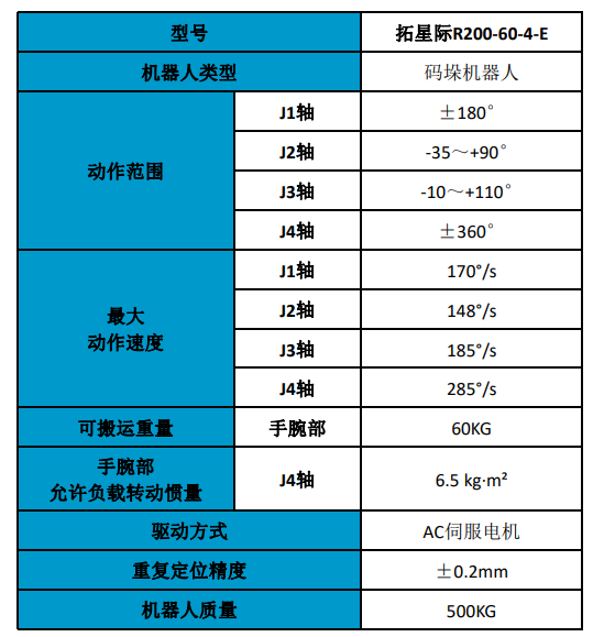 简介:负载60KG,臂展2000mm。可实现可靠、快速、精确连续不断的运送功能。具有维护成本低,使用寿命长,可以同时码垛多条生产线等优点。是化工业、食品、食料等行业的优势之选。相对于六轴机器人,更为便宜实用。