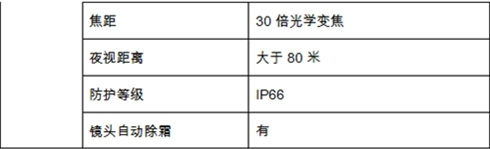 8. 摄像机:30倍光学变焦、夜视距离80米、镜头自动除霜除雾、防护等级IP66,适应昼夜、雨雪等复杂外部环境。