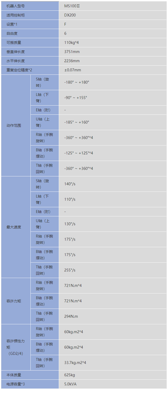 网站首页 > 产品展示 > 工业机器人 > 安川MS100Ⅱ 6轴 负载110kg 工作域2236mm 点焊/搬运 焊接通用机器人 2023-05-27 机器人网 0 百度一下 2023-05-27 机器人网 0 百度一下 适合行业 工业机器人 发布作者 机器人网 最近更新 2023-05-27 18:18:07 概述: 文章详情 品牌名称Yaskawa 对应小型、中型焊枪的多功能机器人6轴垂直多关节负载:110Kg动态范围:2236mm控制柜:DX200用途:点焊、搬运即使是装有装备线缆时机器人的宽度也在500mm以下,实现了生产线的简化流程手腕容许惯性力矩的扩大以及最大伸长度可达2016mm的大动作范围,实现灵活的焊接生产线。*1:F=置地式,W=挂壁式,C=倒挂式,S=支架式(挂壁式时,S轴的动作会有限制,请注意。)*2:JIS B 8432为基准。*3:因用途,动作模式而异。*4:无装备电缆时的值。 联系我们: 安川电机(中国)有限公司 ☉本站某些信息具有时效性,若有错误或已失效,需要更改请留言修改