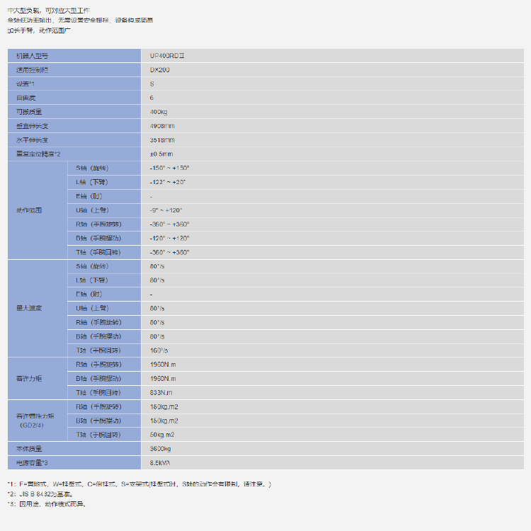网站首页 > 产品展示 > 工业机器人 > 安川UP400RDⅡ 6轴 负载400kg 工作域3518mm 搬运/码垛/喷涂 多功能机器人 2023-05-27 机器人网 0 百度一下 2023-05-27 机器人网 0 百度一下 适合行业 工业机器人 发布作者 机器人网 最近更新 2023-05-27 18:18:10 概述: 文章详情 品牌名称Yaskawa 联系我们: 安川电机(中国)有限公司 ☉本站某些信息具有时效性,若有错误或已失效,需要更改请留言修改