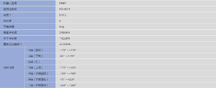 网站首页 > 产品展示 > 工业机器人 > 安川MH6F 6轴 负载6kg 工作域1422mm 装配/切割/搬运/涂胶 装配通用机器人 2023-05-27 机器人网 0 百度一下 2023-05-27 机器人网 0 百度一下 适合行业 工业机器人 发布作者 机器人网 最近更新 2023-05-27 18:18:16 概述: 文章详情 品牌名称Yaskawa 产品特点通用型机器人,即可做弧焊,可以做搬运全轴低功率输出,无需设置安全栅栏,设备构成简易小型控制柜,节省空间产品参数及规格*1:F=置地式,W=挂壁式,C=倒挂式,S=支架式(挂壁式时,S轴的动作会有限制,请注意。)*2:JIS B 8432为基准。*3:因用途,动作模式而异。*4:只限搬运用途。*5:超过1KG的情况因动作范围有异。请根据对应的负载使用正确的动作范围。*6:MH6F的时候是1.0kVA。*7:HP20F的时候是1.5kVA。*8:斜线部分表示的是S轴在-40° ~ +30°的时候P点无法动作的范围。 联系我们: 安川电机(中国)有限公司 ☉本站某些信息具有时效性,若有错误或已失效,需要更改请留言修改