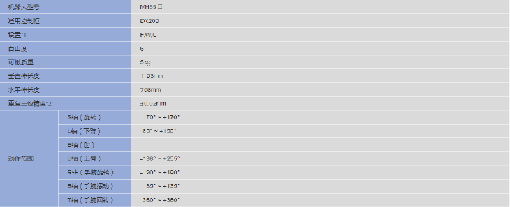 网站首页 > 产品展示 > 工业机器人 > 安川MH5SⅡ/F 6轴 负载5kg 工作域706mm 弧焊/搬运/码垛/喷涂 多用途机器人 2023-05-27 机器人网 0 百度一下 2023-05-27 机器人网 0 百度一下 适合行业 工业机器人 发布作者 机器人网 最近更新 2023-05-27 18:18:17 概述: 文章详情 品牌名称Yaskawa 产品特点小型、轻量、节省空间全轴低功率输出,无需设置安全栅栏,设备构成简易内置式抓手控制气管、搭载线缆,降低机器人与周边设备的碰撞产品参数*1:F=置地式,W=挂壁式,C=倒挂式,S=支架式(挂壁式时,S轴的动作会有限制,请注意。)*2:JIS B 8432为基准。*3:因用途,动作模式而异。*4:超过1KG的情况因动作范围有异。请根据对应的负载使用正确的动作范围。 联系我们: 安川电机(中国)有限公司 ☉本站某些信息具有时效性,若有错误或已失效,需要更改请留言修改