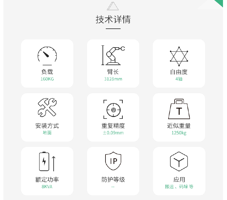 相关信息 LAIDER1000-M46 4轴 负载6kg 工作域1000mm 精度±0.05mm 搬运/包装/检测码垛机器人2023-05-27 18:44:59 迈德尔MDE1400-50 4轴 负载50kg 精度±0.08mm 码垛机器人2023-05-27 18:44:52 耐为ECR50-1850 4轴 负载50kg 精度±0.08mm 码垛机器人2023-05-27 18:43:23 耐为ECR20-1700 6轴 负载20kg 精度±0.06mm 码垛机器人2023-05-27 18:43:23 徳卡 DK120-2400-PL 4轴 负载120kg 精度±0.2mm 码垛机器人2023-05-27 18:28:18 耐为ECR5-1200标准 6轴 负载5kg 精度±0.06mm 码垛机器人2023-05-27 18:28:05