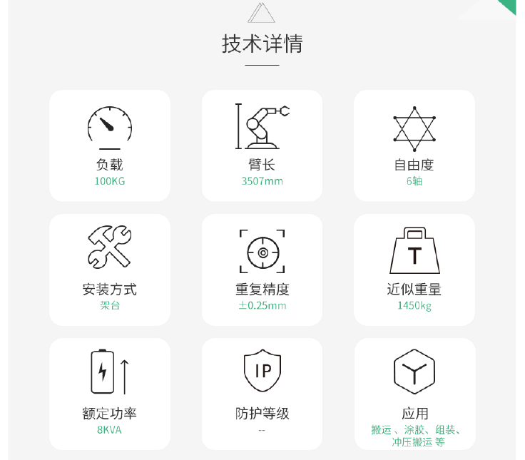 相关信息 锐曼拖地机器人(蜗牛洁霸)2023-05-27 18:44:53 欧铠复合机器人 激光SLAM导航 负载500kg 精度±10mm 复合机器人2023-05-27 18:43:31 智亿 06A-090 6轴 负载6kg 精度±0.08mm 搬运、上下料通用机器人2023-05-27 18:43:29 巨轮 JLRB300 6轴 负载300kg 精度±0.3mm 焊接、码垛通用机器人2023-05-27 18:43:26 卓林 CR5-1500 6轴 负载5kg 精度±0.05mm 搬运、码垛、上下料、焊接通用机器人2023-05-27 18:43:25 卓林 CR25-1900 6轴 负载25kg 精度±0.05mm 搬运、码垛、上下料、焊接通用机器人2023-05-27 18:43:25